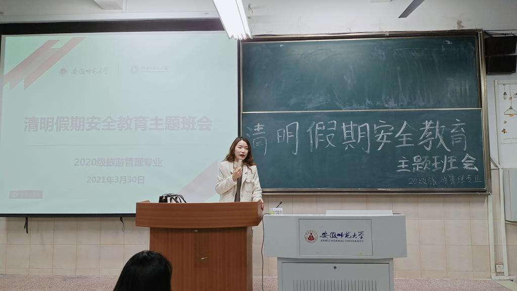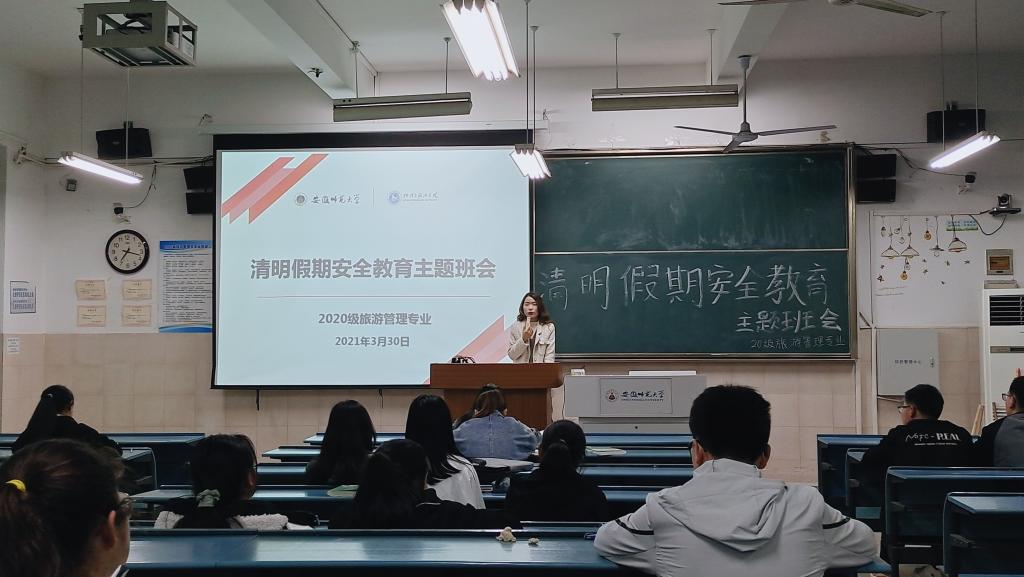 本网讯(地旅学院 赵佳慧 李文萍 孙云峰)举安全之盾,防假期之患。为增强学生假期安全意识,加强安全文明校园建设,全面推进疫情防控常态化校园管理和素质教育,构建安全和谐校园,3月30号晚,必赢76net线路官网2020级旅游管理专业开展了清明节离校安全教育主题班会,会议由2020级旅游管理专业辅导员赵佳慧主持,2020级旅游管理专业全体同学参加了此次班会。