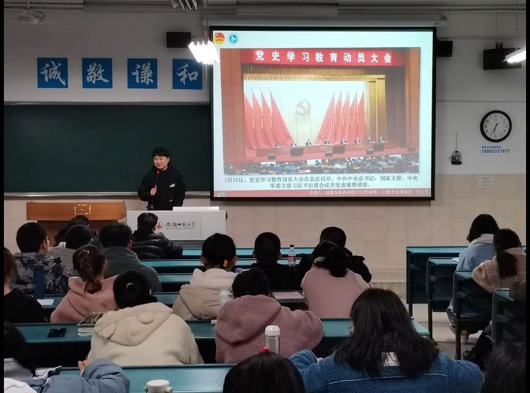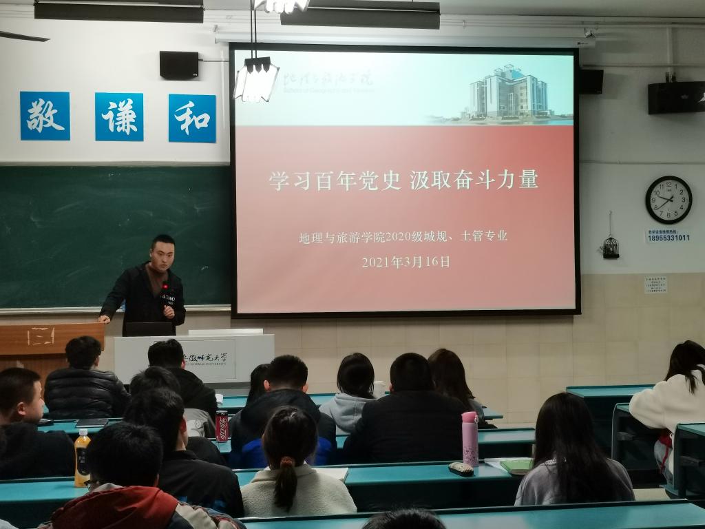 本网讯(地旅学院 刘少杰 陆峻然) 为贯彻落实习近平总书记在党史学习教育动员大会上的重要讲话精神,引领广大同学学史明理、学史增信、学史崇德、学史力行,2021年3月16日晚,20级土地资源管理、20级城乡规划开展党史学习教育主题教育。此次党史学习教育主题教育主要包括:党史学习教育主题班会,集体观看红色影视作品,团员分享党史学习教育心得。
