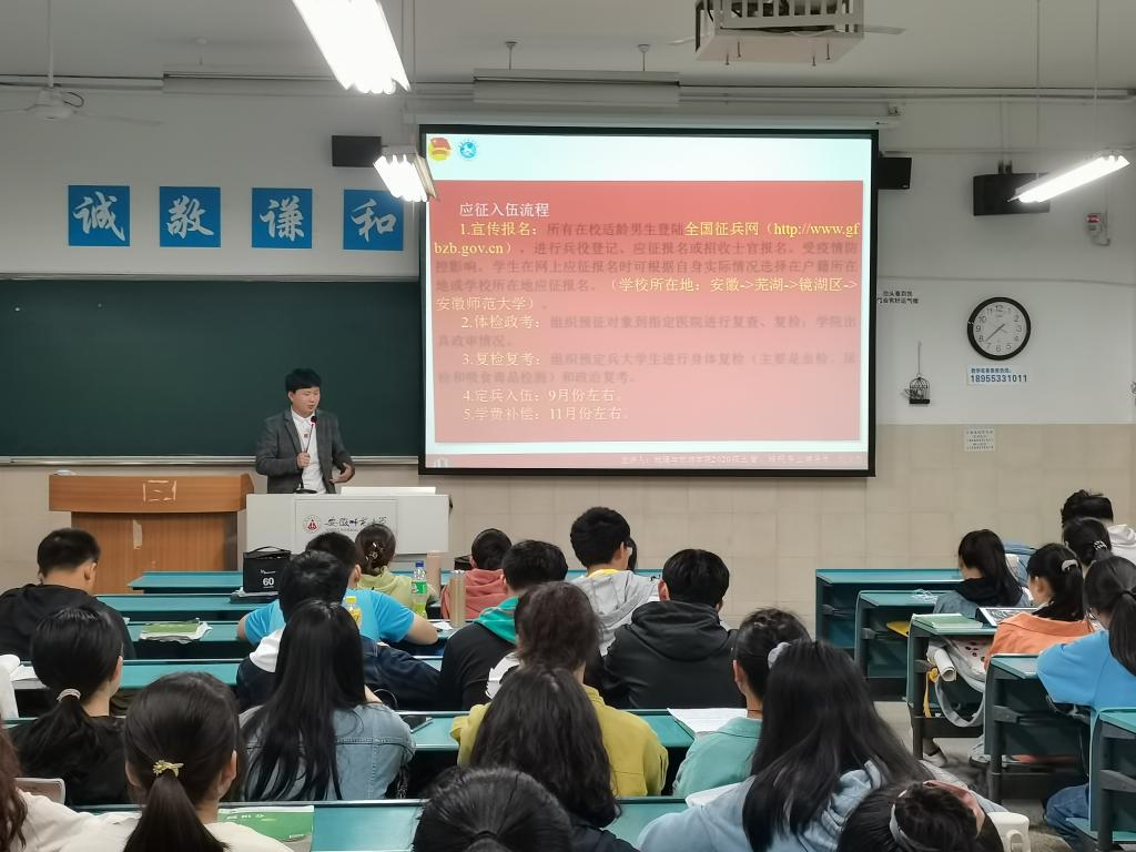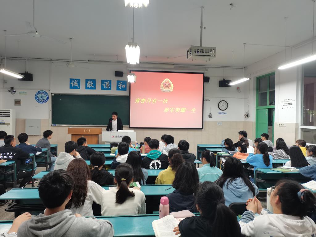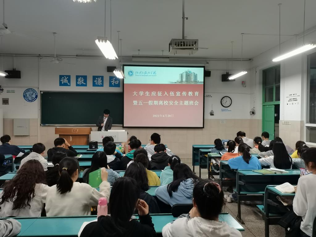 本网讯(地旅学院 刘少杰 袁明峻 陆峻然)为号召青年学生携笔从戎,参军报国,为实现中国梦、强军梦贡献力量。4月28日晚,2020级土地资源管理和2020级城乡规划专业召开大学生应征入伍宣传教育主题班会。会议由辅导员刘少杰主持,2020级土地资源管理与2020级城乡规划专业的全体同学参加了此次班会。