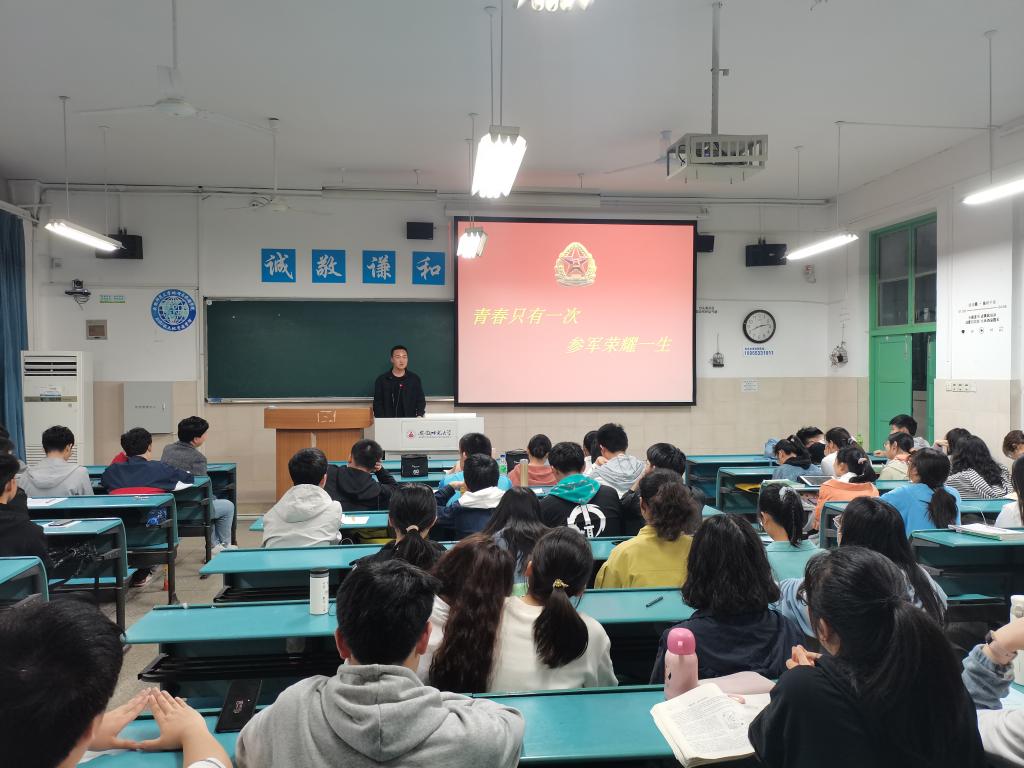 首先辅导员刘少杰给大家分别介绍了2021年下半年男兵和女兵的报名时间节点、应征入伍的流程和相关注意事项以及征兵的意义及相关优惠政策。接着刘少杰向大家介绍了我国优秀青年军人的典型事例以及我们身边的优秀大学生军人代表,鼓励同学们向榜样看齐,积极投身到军营,报效国家。刘少杰说到,大家一定要树牢爱国意识,坚定理想信念,要珍惜现在的学习生活条件,要时刻牢记是党和国家给我们创造了这么好的学习生活条件,我们需要做什么来报答党和国家。最后,班内退役军人王宏志向大家分享了在部队服役两年的收获和感受,并动员大家积极主动投身到军营中去,实现人生的理想价值;即将报名入伍的优秀学生代表王令帅给大家分享了自己想要入伍的初心以及坚定的信念,他说,好男儿就应该走到军营去!