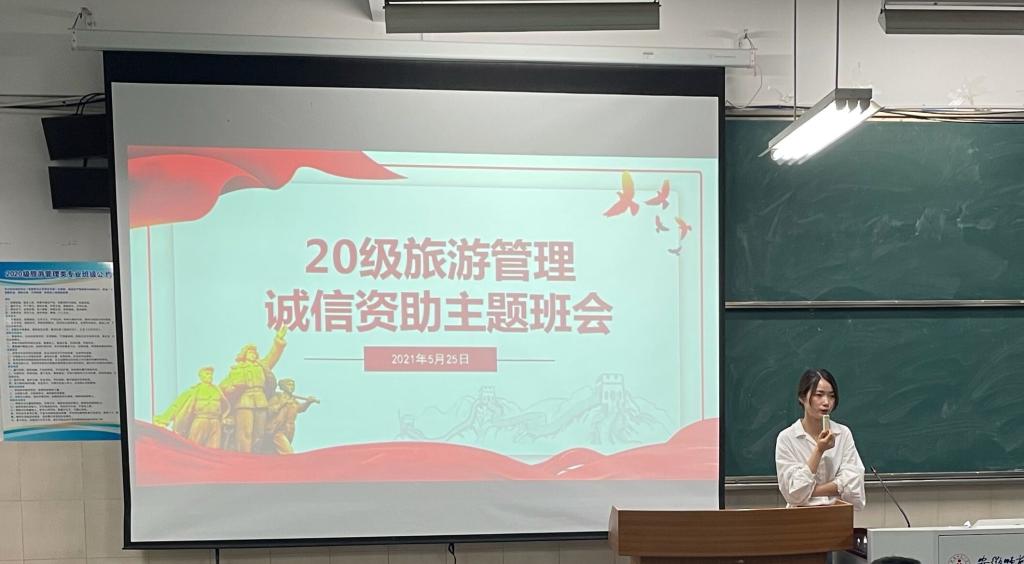 本网讯 (地旅学院 赵佳慧 孙云峰)为进一步深化和巩固诚信教育成果,引导新时代大学生涵养以诚立身、以信致远的良好品质,从而营造诚实守信重诺践诺的校园文化氛围,5月25日晚,20级旅游管理专业于行知楼四号楼203教室举办诚信主题教育班会,班会由辅导员赵佳慧主持,20级旅游管理专业全体学生参加本次班会。