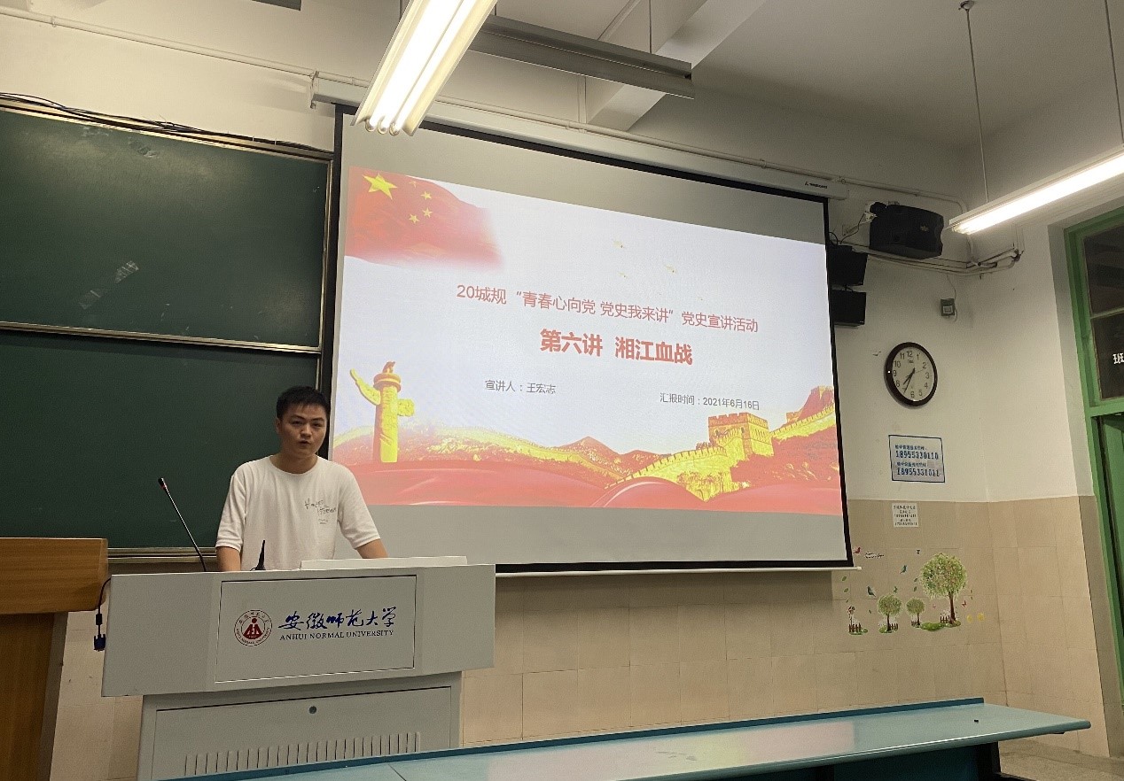 本网讯(地旅学院 刘少杰 耿艺榕)为全面贯彻落实习近平总书记在党史学习教育动员大会上的重要讲话,积极响应“学史明理、学史增信、学史崇德、学史力行”的号召,推动“学党史、强信念、跟党走”学习教育持续深化,强化爱国主义教育。6月16日晚七点半,2020级城乡规划班“青春心向党 党史我来讲”党史宣讲主题活动第六讲开讲。本次主讲人为入党积极分子王宏志,主题为《湘江血战》。