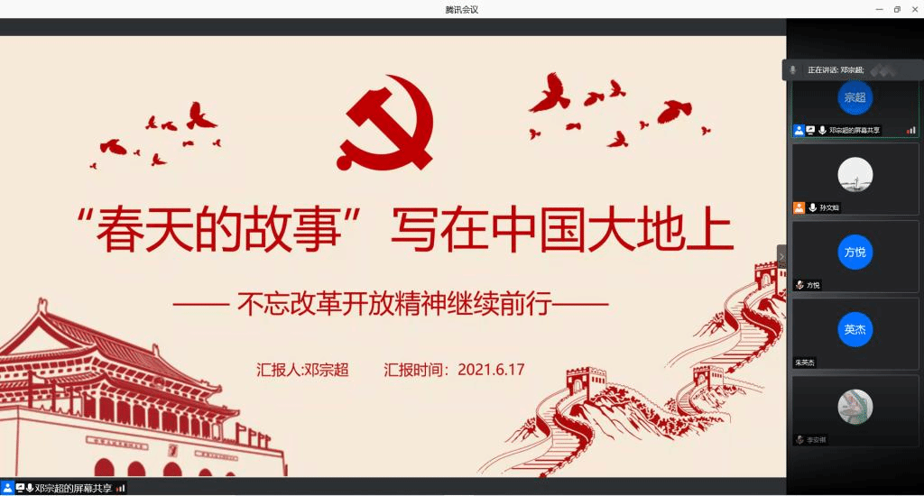 专题学习会上组织委员邓宗超首先从政治、经济两个方面向大家介绍了改革开放的历史背景,接着通过衣、食、住、行四个方面阐述了改革开放对我们生活的影响并在专题学习会的最后指出改革开放在当今的时代内涵,让改革开放精神放射出新的时代光芒。