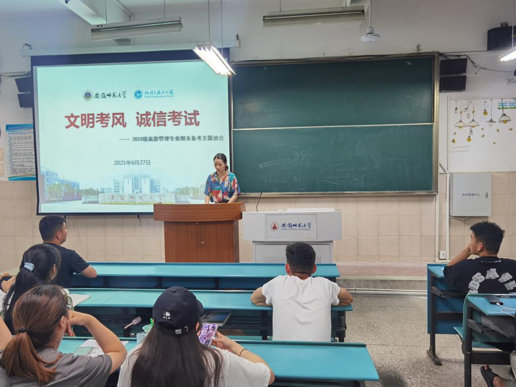 本网讯 (地旅学院 赵佳慧 孙云峰)期末考试临近,为树立优良学风,严格考风考纪,6月28日晚七点,2020级旅游管理专业在行知楼4号楼203教室召开“文明考风,诚信考试”主题班会。班会由辅导员赵佳慧主持,2020级旅游管理专业全体同学参与。