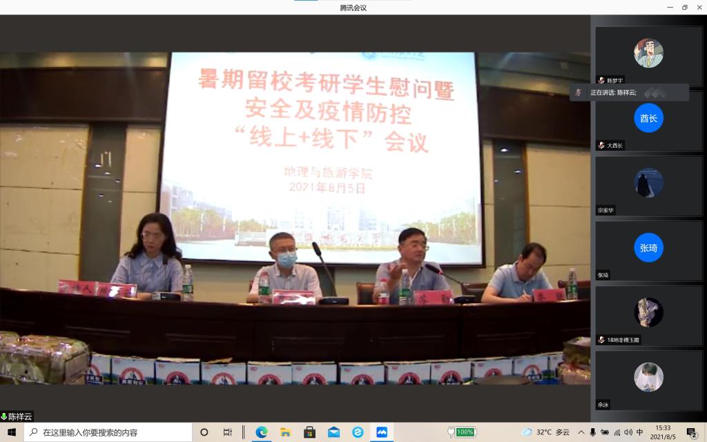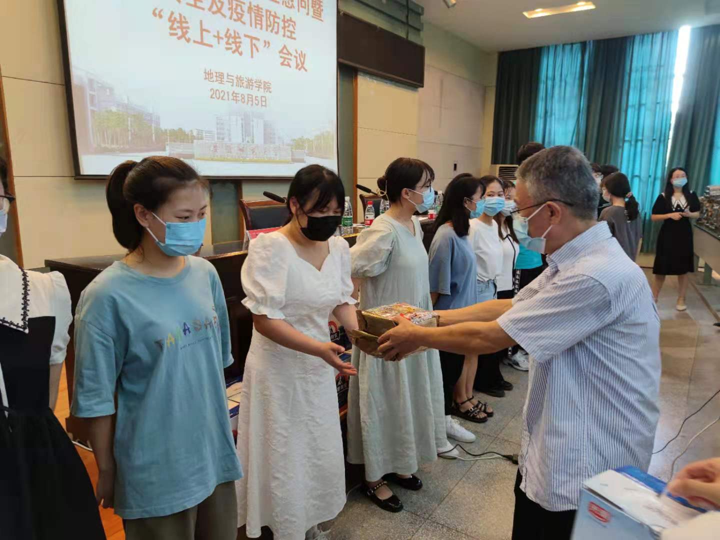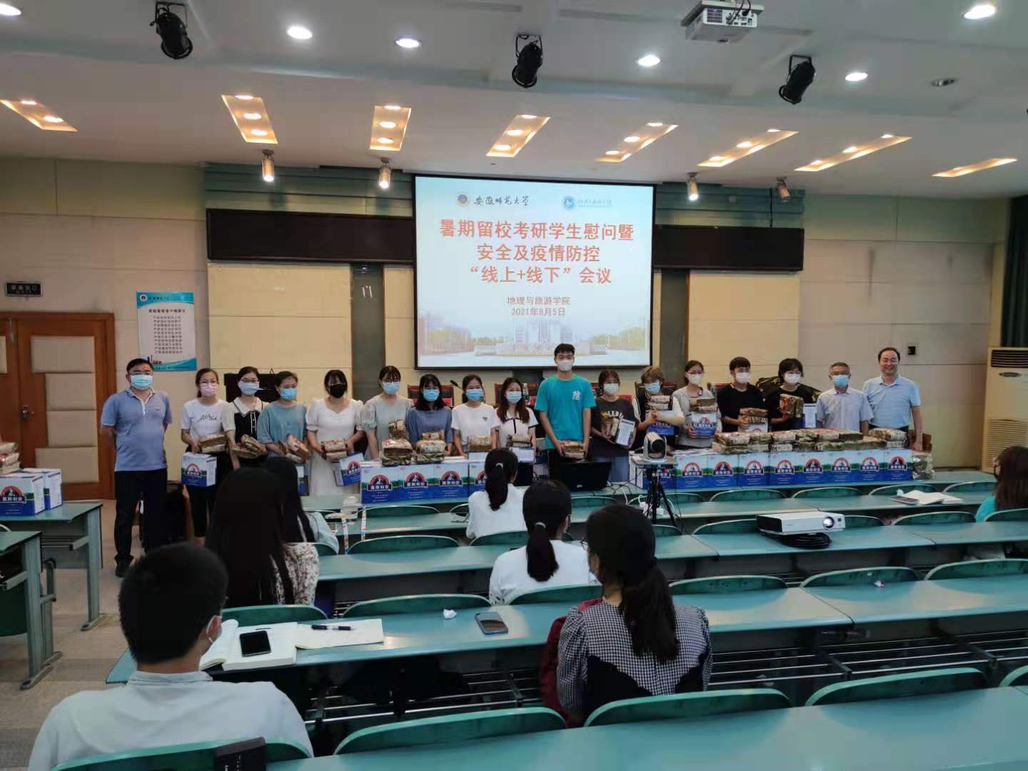 本网讯(地旅学院 丁茹栩)8月5日下午,地旅学院在实验楼101报告厅召开2022届暑期留校考研学生慰问暨安全及疫情防控“线上+线下”会议。地旅学院党委书记贾冠忠、院长苏勤、院党委副书记乔静以及2018级本科生辅导员出席会议。会议严格遵守疫情防控规定,采取“线上+线下”的形式,部分暑期留校考研学生代表现场参加会议,其余考研留校学生通过腾讯会议线上参会。会议由院团委书记、2018级本科生辅导员陈祥云主持。