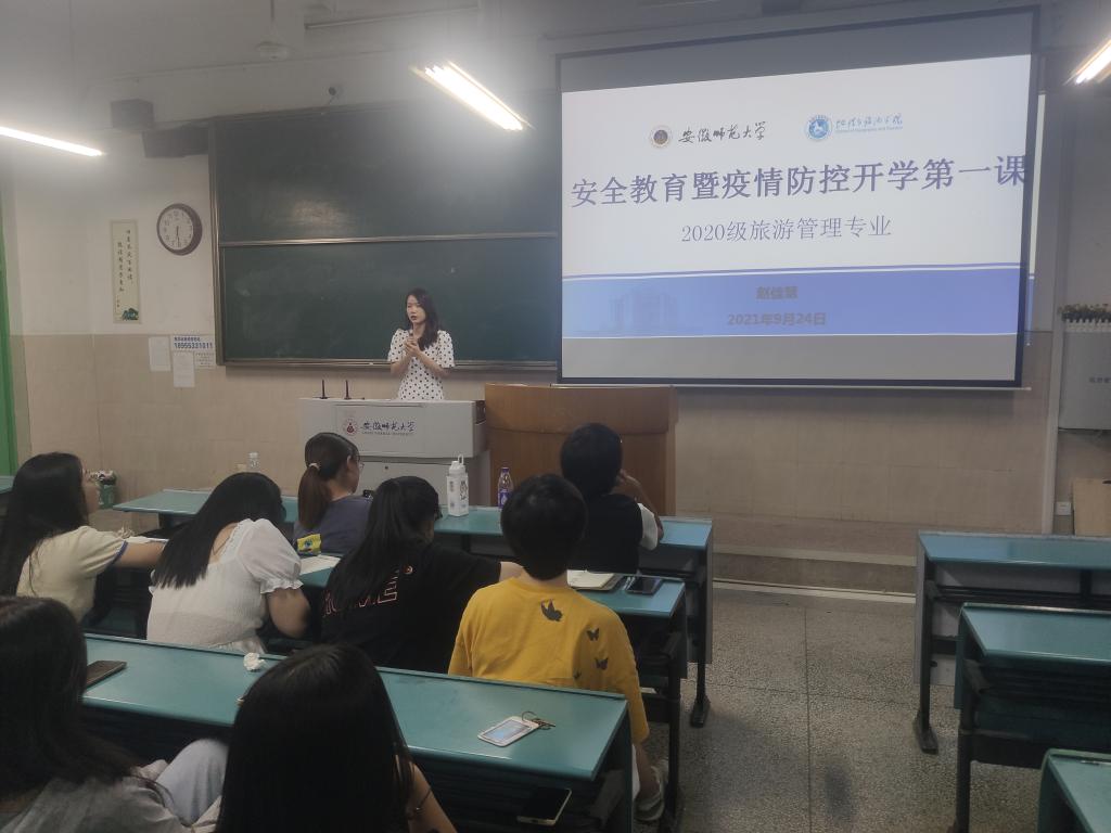本网讯(地旅学院 赵佳慧 舒玉茹)疫情防控常态化,安全教育不松手。为积极响应学校关于加强学生安全教育的号召,加强学生安全意识,同时结合疫情防控常态化背景下提醒同学们重视疫情防控工作,营造良好学习生活环境,为新学期在校的学习生活保驾护航。2020级旅游管理专业于9月24日晚在行知楼2号楼103教室召开主题班会。班会由辅导员赵佳慧老师主持,2020级旅游管理全体同学参加。