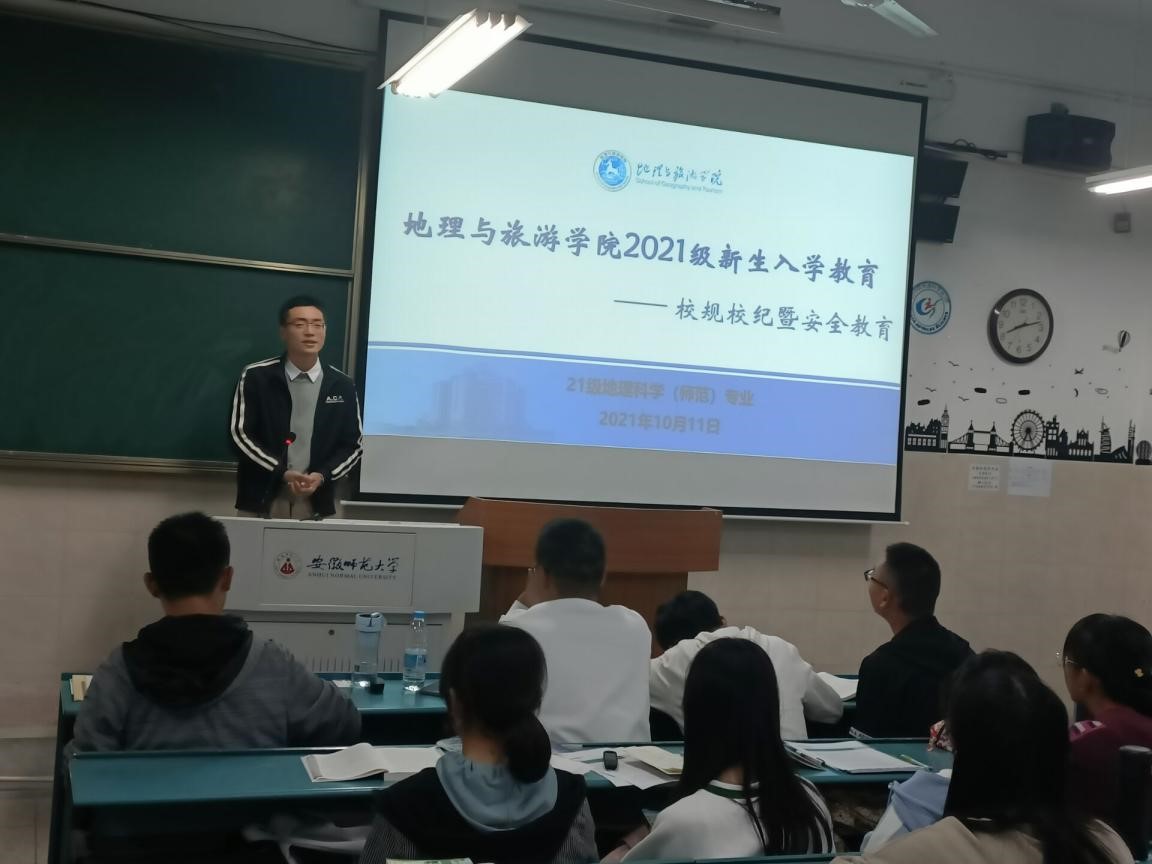 本网讯(地旅学院 韩红豆 王彩安)为加强学生日常管理,切实增强学生的安全防范意识和避险能力,10月11日晚,2021级地理科学(师范)专业在行知楼2040204召开新生入学安全教育班会。会议由辅导员韩红豆主持,21级地理科学(师范)全体同学参加。