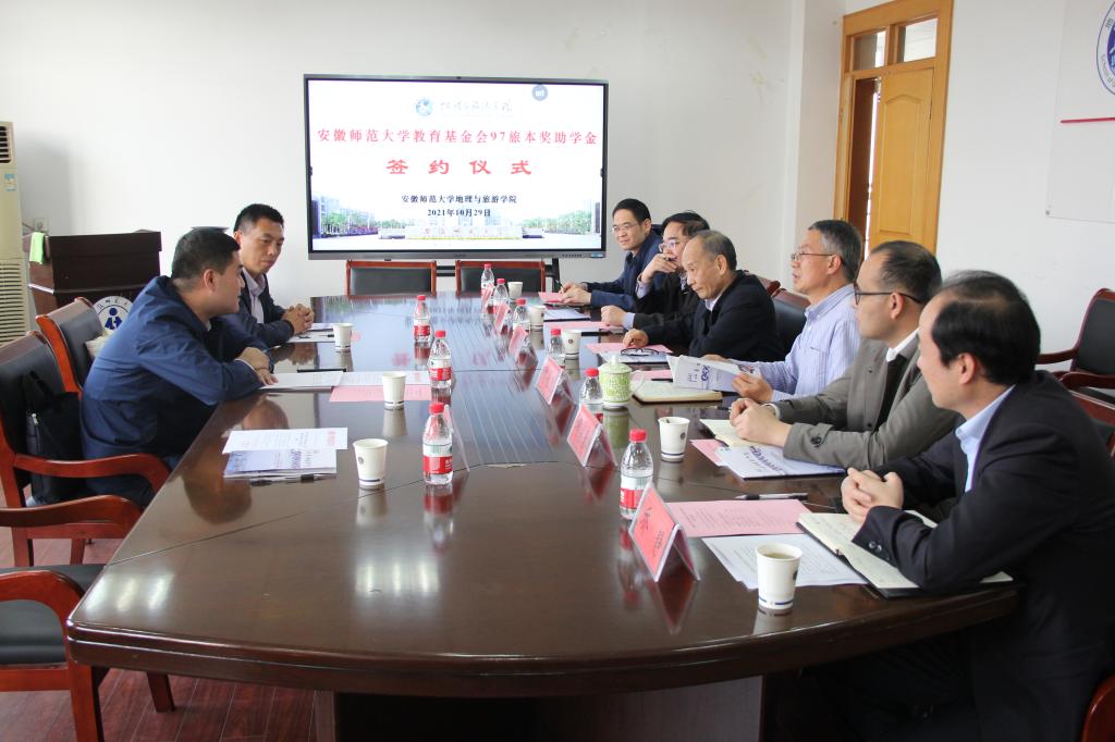 本网讯(地旅学院 吴思慧 彭媛媛)10月29日下午,安徽师范大学97旅本奖助学金二期签约仪式在必赢76net线路官网行政楼四楼会议室举行。我校1997级旅游管理专业本科班校友代表窦贤琨、张启全、尹寿兵,校教育基金会秘书长贡植斌、校学生工作处副处长项家春、必赢76net线路官网党委书记贾冠忠、院长苏勤、校教育基金会秘书苏军等出席签约仪式,仪式由院党委副书记乔静主持。