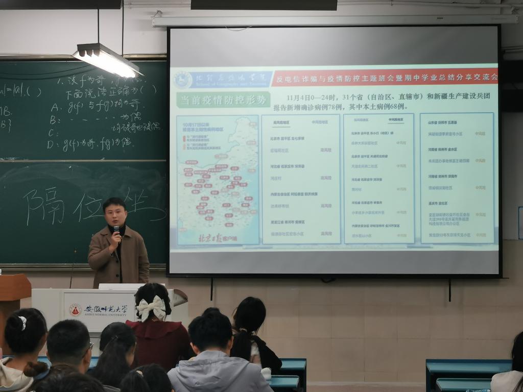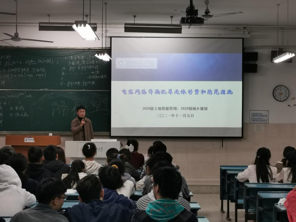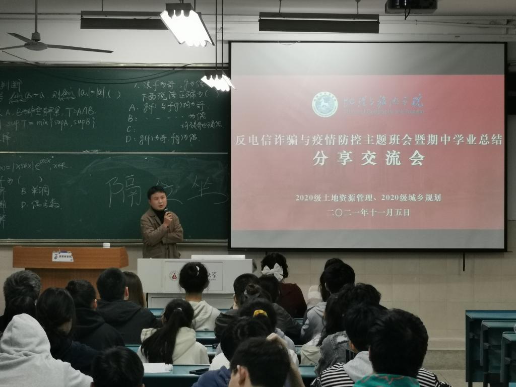 本网讯(地旅学院 刘少杰 张楠)为进一步加强学生的安全教育管理,提高学生的防诈骗意识,营造平安和谐稳定的校园环境,11月5日晚,20级城乡规划和20级土地资源管理专业召开“反电信诈骗与疫情防控”主题班会。此次会议由辅导员刘少杰主持,20级城乡规划和20级土地资源管理专业全体学生参与。