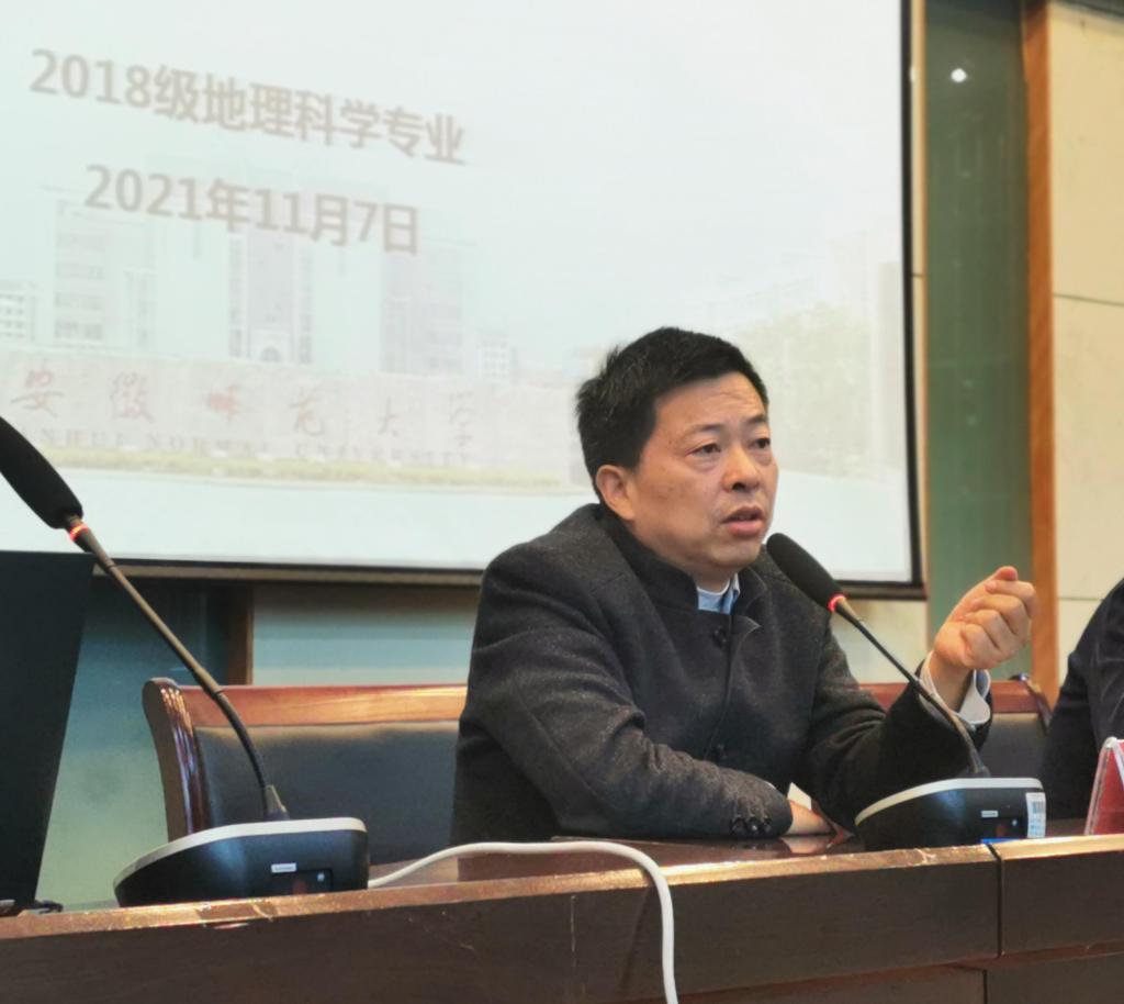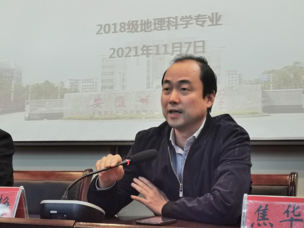 本网讯(地旅学院 文/张慧 李娜 图/丁茹栩 尹仟仟)11月7日晚,地旅学院在学院实验楼101报告厅举行皖南地区人文地理综合实习动员大会暨皖南实习专业讲座“线上+线下”会议。地旅学院副院长曹卫东,党委副书记乔静,实习指导教授焦华富、吴立、赵春雨、方叶兵及辅导员丁茹栩、张慧出席会议。会议严格遵守疫情防控规定,采取“线上+线下”的形式,2018级地理科学专业班委、寝室长参与线下会议,其余学生参与线上腾讯会议。会议由带队老师吴立主持。