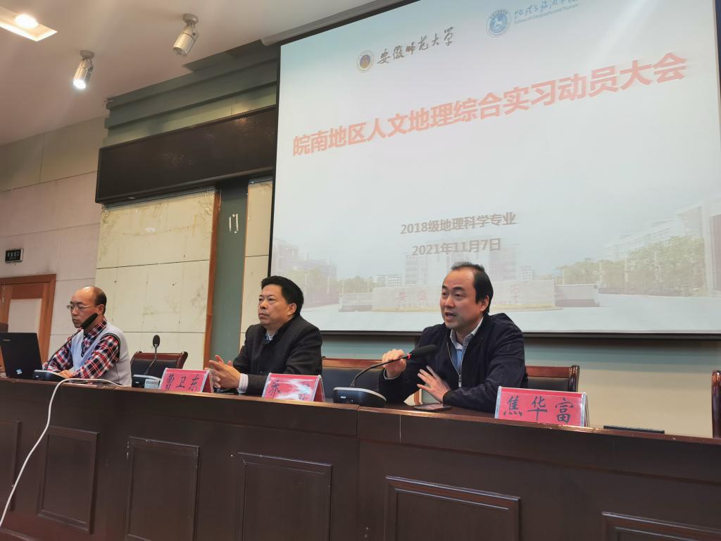 11月7日晚,全体实习师生在地旅学院实验楼101报告厅举行皖南地区人文地理综合实习动员大会暨皖南实习专业讲座“线上+线下”会议。动员大会上,副院长曹卫东强调了皖南地区实习的重要性;党委副书记乔静就防疫工作、实习安全及纪律问题向同学们提出要求;实习指导教授焦华富、吴立分别从人文和自然地理角度出发,详细介绍皖南地区风土人情和自然地貌等特征,收获底下同学们阵阵掌声。