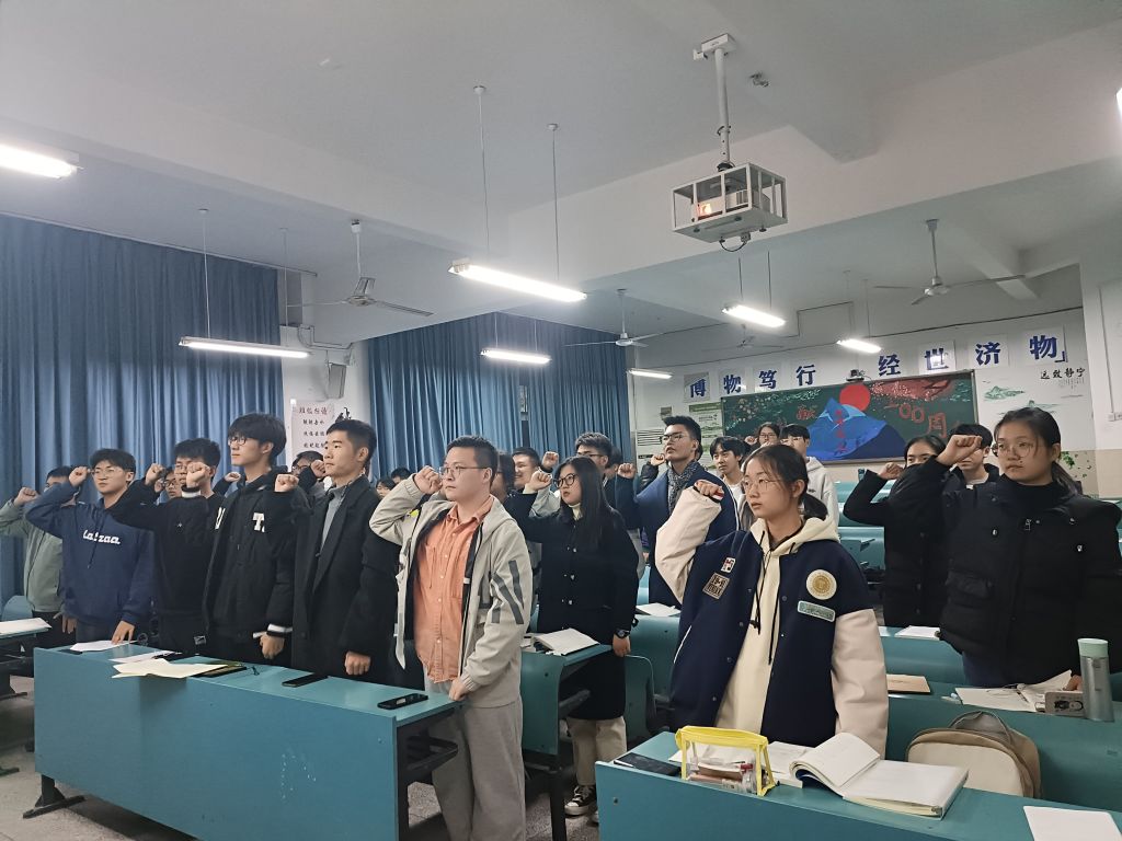 最后全体团员起立重温入团誓词,举起右拳,2021级地理科学拔尖人才班第一次团支部大会在着激昂的誓词中落下帷幕。