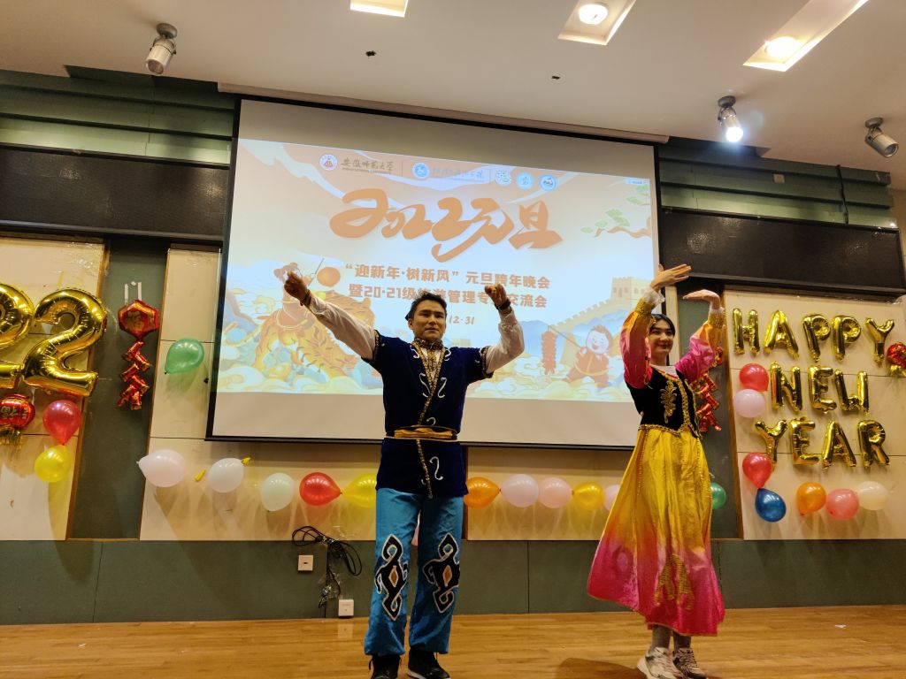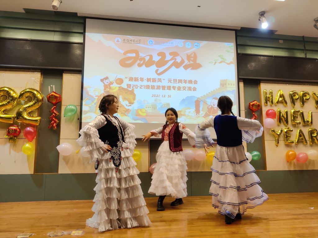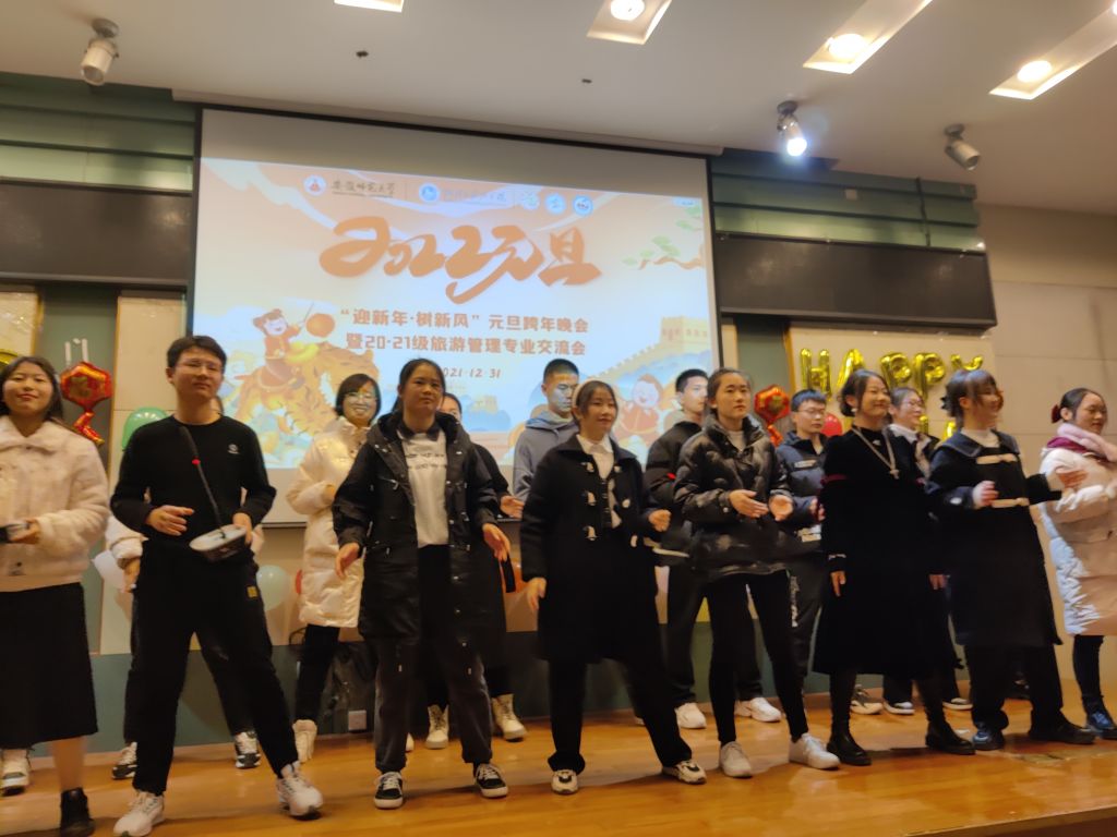 晚会过程中,同学们精心编排的节目形式多样、内容丰富。来自20级旅游管理专业的少数民族同学带来民族舞串烧开场,展现了别样异域风情,点燃现场气氛;紧接着,《爱情转移》《稻香》等经典歌曲的演唱更是将晚会气氛推向高潮。随后的古典歌曲以及现代舞的串烧又为同学们带来了一场视听盛宴。歌舞表演之间,亦有良言分享。20级旅游管理专业团支书徐雨菲、宣传委员舒玉茹两位同学为21级学弟学妹们带来了满满“干货”经验分享。晚会表演过程中还穿插了几个互动小游戏,加强了同学老师们的交流,尽显专业风采。随着节目的轮番上演,晚会现场掌声如潮,喝彩不断。师生们共度了近两个小时的美好时光。最后元旦晚会在歌曲《明天会更好》的动听旋律中完美落幕。