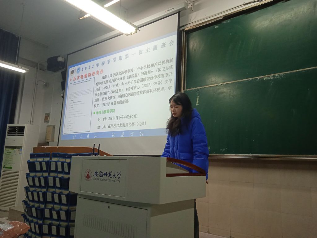 本网讯(地旅学院 张慧 李娜)为增强学生安全意识,保障学习生活平稳运行,2月20日晚上19点,2018级地理科学(非师范)专业、2018级城乡规划专业2022年春季学期第一次主题班会顺利举行。班会由辅导员张慧主持,会场分为行知楼2号楼104教室和腾讯会议室,2018级地理科学(非师范)专业、2018级城乡规划专业全体同学参加。